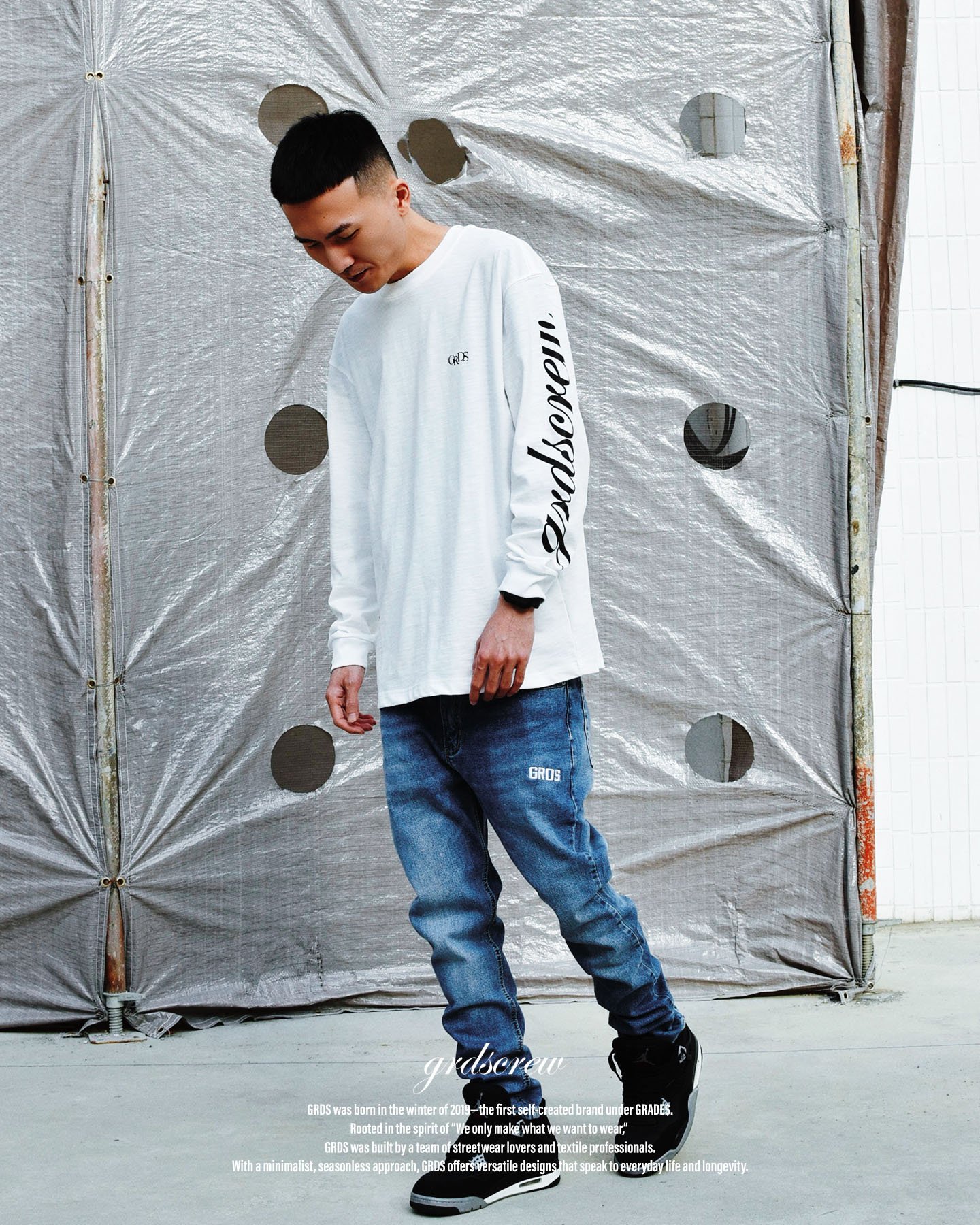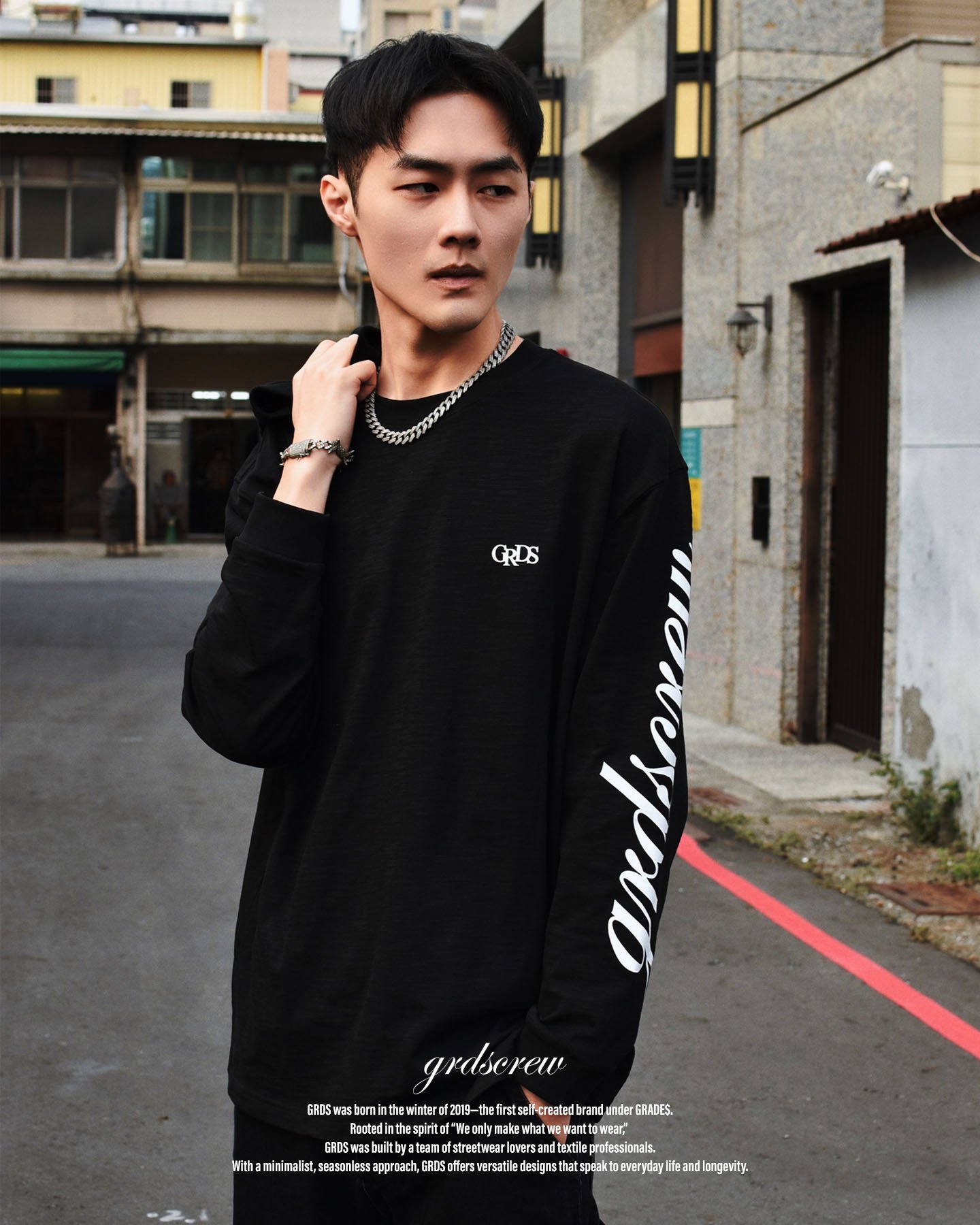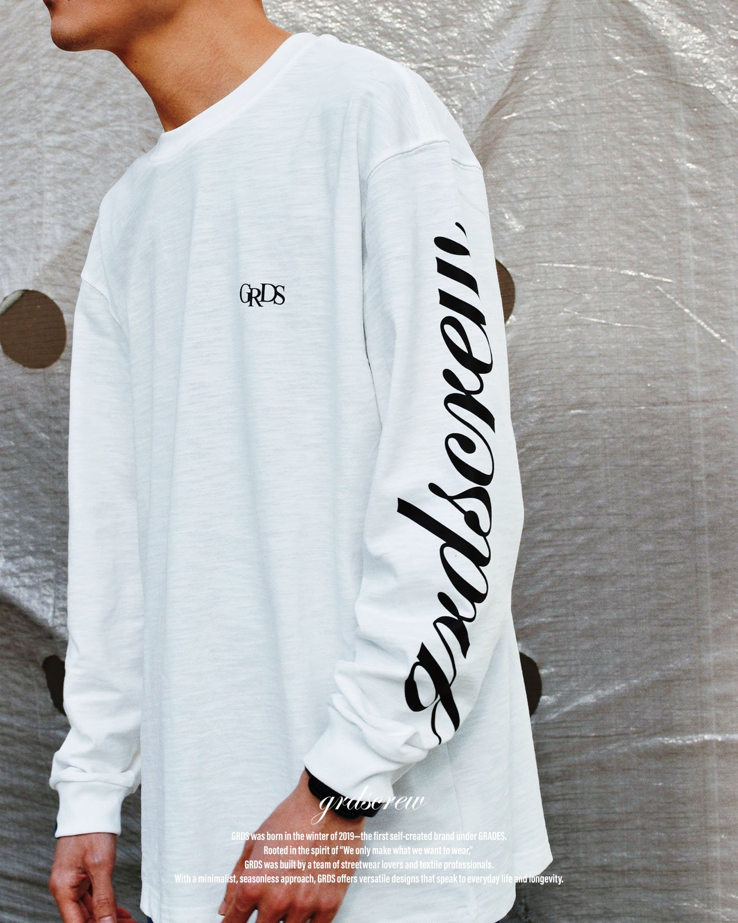 胸前配置 GRDS 刺繡 Logo,低調呈現品牌識別;袖部經典方標設計,提升整體完成度與視覺層次。