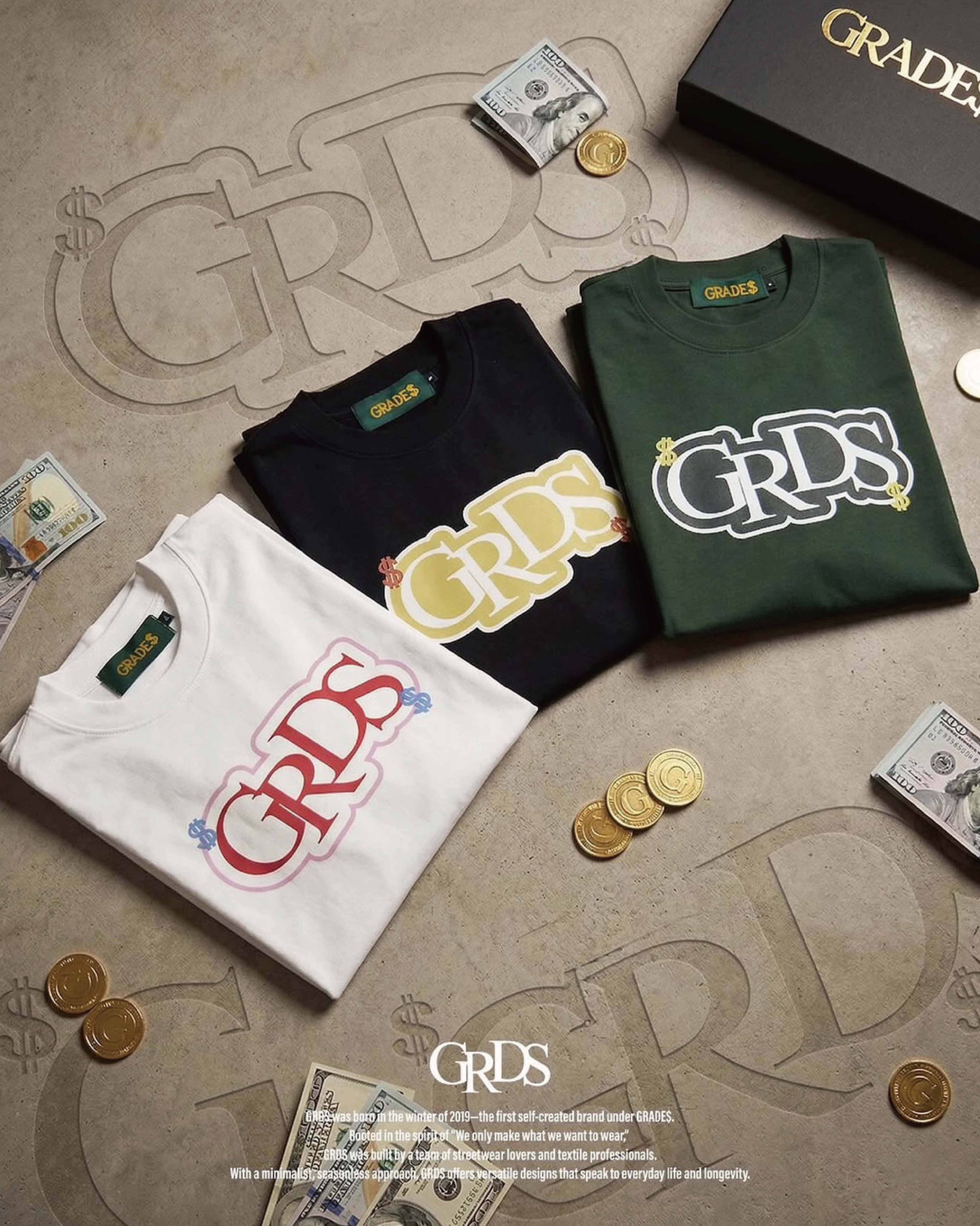 繽紛色彩與俏皮美元符號的視覺佈局,構築出活潑卻不失質感的平衡感。下方的品牌精神宣言與趣味圖像交織碰撞,堆疊出輕快的街頭底蘊,傳遞 GRDS 對於玩心的純粹追求。